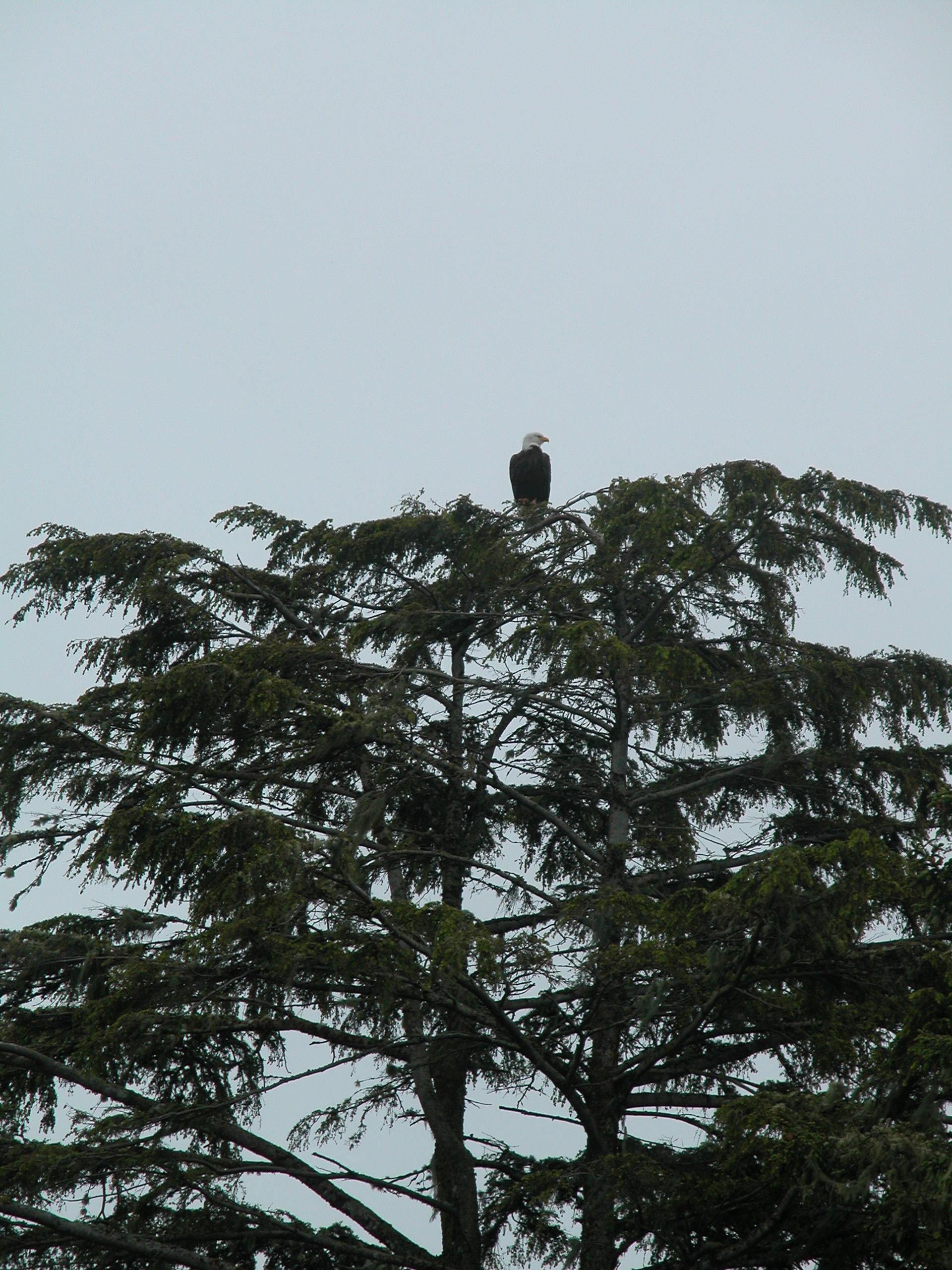 Eerst zien we een zeeotter die rustig op zijn rug dobbert en af en toe onderduikt. Verderop spotten we een bald eagle die met zijn jongen op een eiland zit. Dan, in de verre verte, duikt de Gray whale op en we krijgen zelfs een mooi uitzicht van de waterfontein die hij uitblaast. Koen, Bram en Linda voelen zich niet zo lekker door de deining van de zee, maar als we weer terugvaren, zien we zelfs nog een zwarte beer die in het water zwemt en naar een eiland klimt.