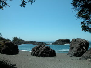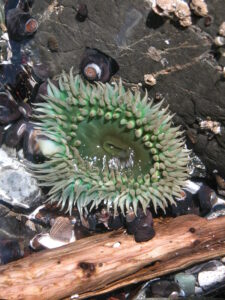 Voordat we het Pacific Rim National Park binnengaan, stoppen we bij het Visitor Center voor wat informatie en om een vergunning voor het strand te verkrijgen. We rijden naar South Beach, waar we een wandeling maken over het strand, op zoek naar schelpen en krabben. De tide pools zijn helaas niet goed zichtbaar door het hoge water, maar we spotten nog wel groene anemonen en kleine krabbetjes.