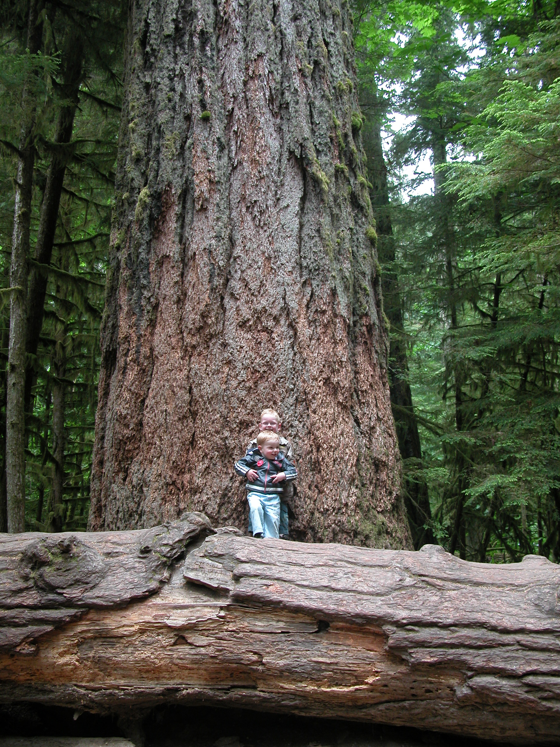 Een stukje verderop ligt MacMillan Provincial Park. We eten eerst in de camper en lopen daarna de bekende Cathedral Grove Trail langs de gigantische red cedars. Overal klimmen, klauteren en ontdekken – voor de kinderen is het één groot avontuur. Nog een klein stukje van de Old Growth Trail en dan slaat de vermoeidheid echt toe.