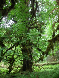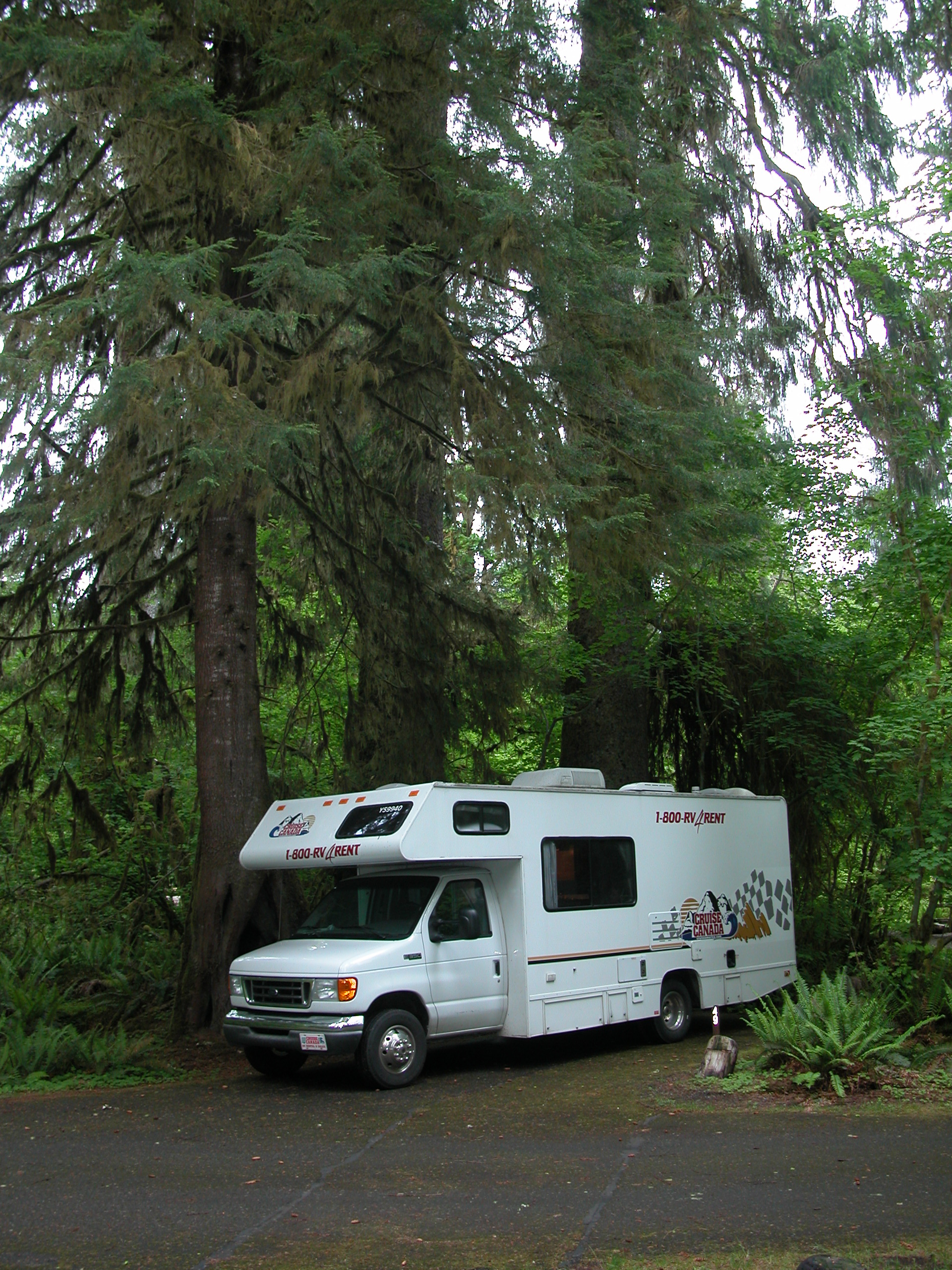 Na deze wandeling smaken de hotdogbroodjes extra goed. Zodra we weer rijden, is het snel stil achterin. We nemen de weg naar het Hoh Rain Forest, door het Olympic National Forest waar de bomen zwaar begroeid zijn met mos. De gigantische Sitka spruce laten zien hoe ideaal de groeiomstandigheden hier zijn.