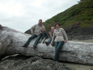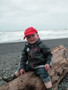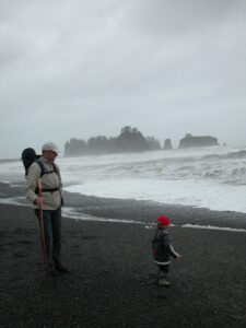 We zijn van plan om te lunchen in Forks, maar gezien het beperkte aanbod en de sombere uitstraling rijden we door naar Rialto Beach. Door de laaghangende bewolking hangt er een mysterieuze sfeer. De ‘duinen’ bestaan hier uit aangespoelde, ontwortelde bomen waar we overheen klauteren om bij de zee te komen.De kinderen gooien takken en stenen in de woeste zee, tot een onverwacht krachtige golf Bram omver trekt. Nat en geschrokken, maar gelukkig ongedeerd. We maken een flinke strandwandeling en nemen mooie aangespoelde takken en zelfs een stukje spons mee. Ook hier zien we weer twee bald eagles vliegen en landen in de bomen langs het strand.