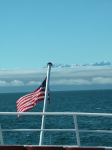 Aan boord zoeken we eerst het dek op. De overtocht duurt zo’n anderhalf uur, maar door de deining aan de voorkant van het schip verhuizen we al snel naar het overdekte terras aan de achterkant. Daar is het rustiger en het uitzicht is schitterend: de bergen van Olympic National Park steken boven de wolken uit.