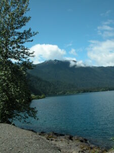Bij vertrek is de lucht strakblauw en schijnt de zon al volop. We verlaten Sol Duc en rijden opnieuw langs Lake Crescent, dat er in het ochtendlicht prachtig bij ligt. De laatste flarden wolken hangen nog rond de bergtoppen en maken het plaatje compleet.